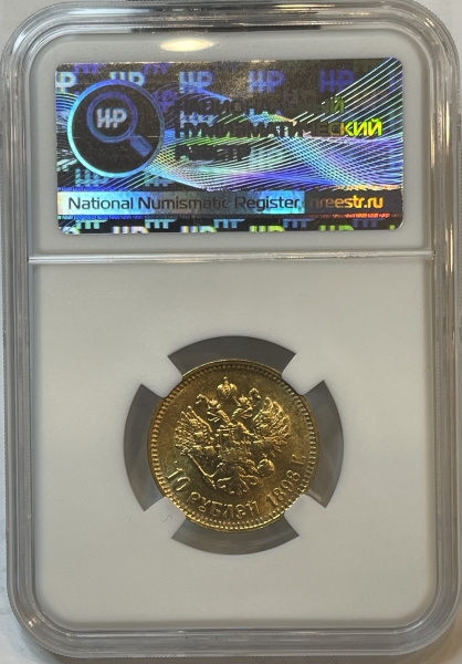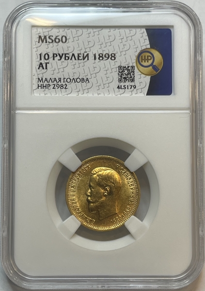 Золотая монета 10 рублей Николай II 1898г., АГ, Малая голова, в слабе ННР MS 60