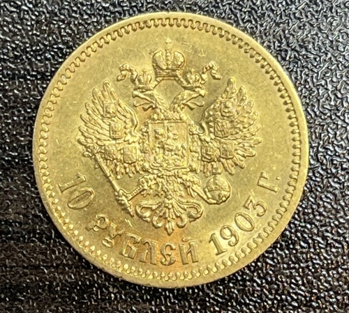 В центре изображен Малый Государственный Герб Российской империи - двуглавый орёл, головы которого увенчаны двумя коронами, третья, большая корона над ними. Все они соединены орденской лентой ордена Св. апостола Андрея Первозванного. На груди орла расположен Московский герб - щит с изображением Георгия Победоносца с копьём поражающего дракона. Вокруг щита цепь ордена Св. апостола Андрея Первозванного. На крыльях изображены гербы: Царства Казанского, Польского, Херсонеса Таврического, Астраханского, Сибирского, Грузинского и герб соединенных княжеств Киевского, Новгородского и Владимирского — по 4 на каждое крыло. В правой лапе орла – скипетр, в левой – держава. Под ним слева направо изображены: номинал - надпись «10 РУБЛЕЙ» и дата выпуска «1903 Г.». По окружности канта имеются рельефные элементы, выполненные в виде зубцов.