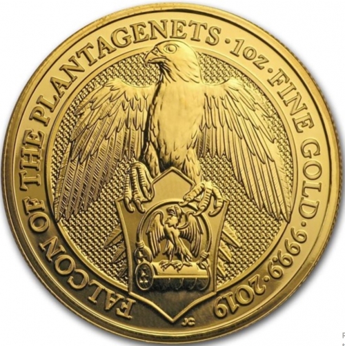Реверс: На реверсе  изображение сокола, держащего в лапах щит. По кругу монеты - надписи на английской языке, обозначающие "Сокол Плантагенетов", 1 тройская унция чистого золота 999,9 пробы. Далее идет год выпуска монеты - 2019. Снизу, под изображением сокола, указаны инициалы дизайнера монеты - JC (Jody Clark).