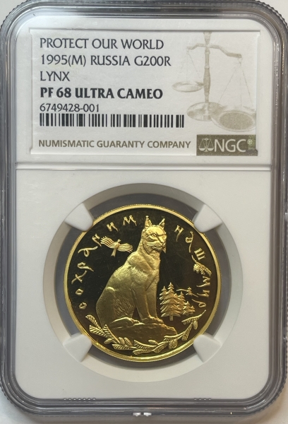 Золотая монета 200 рублей "Рысь" 1995г., 31,1г., Au 999, в слабе NGC PROOF 68 ULTRA CAMEO