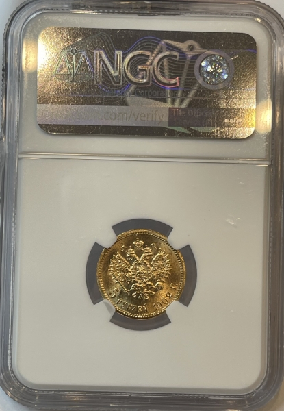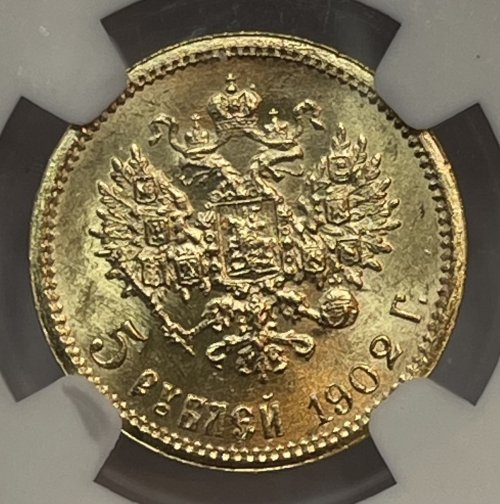 Золотая монета 5 рублей Николай II 1902 г. в слабе NGC MS 65