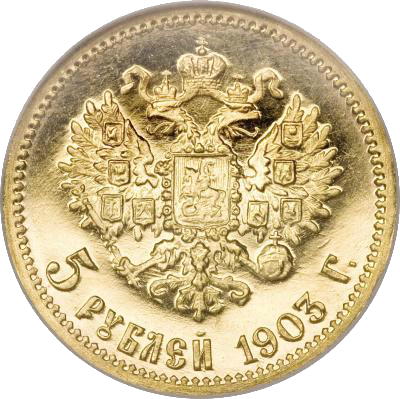 Под гербом полукругом вдоль канта указан номинал и год чеканки - "5 РУБЛЕЙ 1903 Г."