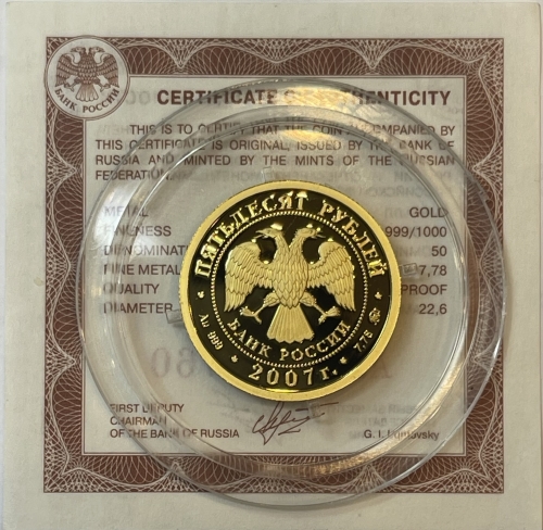 Золотая монета 50 рублей "к 450-летию добровольного вхождения Башкирии в состав России" 2007 г., Au 999, ММД, 7,78 г.