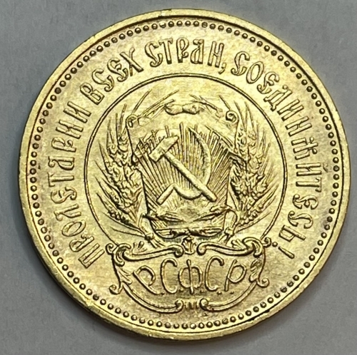 Одновременно с выпуском бумажных червонцев, в октябре 1922 года было принято решение о выпуске золотых червонцев в виде монет. По своим весовым характеристикам (8,6 г, 900 проба) и размерам червонец полностью соответствовал дореволюционной монете в 10 рублей. Автором рисунка стал главный медальер монетного двора АФВасютинский (также автор окончательного варианта ордена Ленина и первого значка ГТО). На аверсе монеты был изображён герб РСФСР; на реверсе — крестьянин-сеятель, выполненный по скульптуре ИДШадра (натурщиками были два крестьянина деревни Праговая Шадринского уезда Перфилий Петрович Калганов и Киприян Кириллович Авдеев), ныне находящейся в Третьяковской галерее. Монета была отчеканена на Петроградском монетном дворе в 1923 году тиражом 2 751 000 экземпляров.[3]