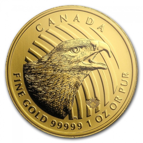 • Реверс: изображен орел с открытым клювом, готовый поймать добычу. Внизу по ободу помещена надпись: «FINE GOLD 99999 1 OZ OR PUR» (1 унция золота пробы 0,99999 или чистого золота), вверху указана страна-эмитент – «CANADA» (Канада).