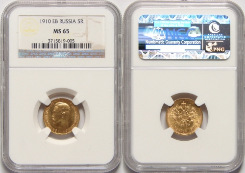 В 1910 году пятирублевая монета изготавливалась Санкт-Петербургским монетным двором из золота 900 пробы относительно небольшим тиражом, потому сейчас её цена значительно выше других пятирублевых монет эпохи Николая 2. Обычно цена золотых монет зависит от стоимости металла, из которого она выполнена, её состояния и сохранности. Редкие разновидности этой монеты пока не найдены.